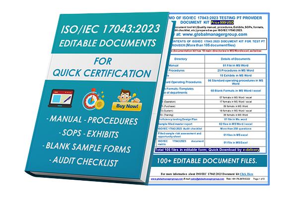 The updated ISO 17043:2023 documentation kit is especially for meeting the documentation needs of Proficiency Testing Providers for Testing Laboratories in accordance with the revised standard. Punyamï¿1⁄2s team of ISO/IEC 17043 consultants having vast experience in ISO/IEC 17043 system implementation and accreditation for PT providers has created this documentation package which contains technical documents also. The ISO 17043 Manual, procedures, SOPs, ISO 17043:2023 audit checklist, blank formats as well as pre-designed PT testing plans are the most important part of this ISO 17043 documents kit. Easily editable documents of this new kit take care of all the ISO 17043 accreditation requirements for proficiency testing providers for testing laboratories. ISO 17043 consultants or any users of this kit can modify the given templates as per their organizationï¿1⁄2s working system and create documents for their laboratory.