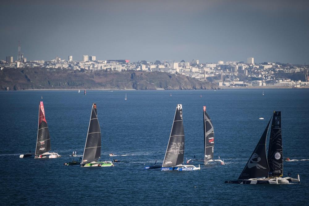 Under bright Winter sunshine in the Brittany port of Brest, the first such race on super-powerful but relatively fragile trimarans got underway.