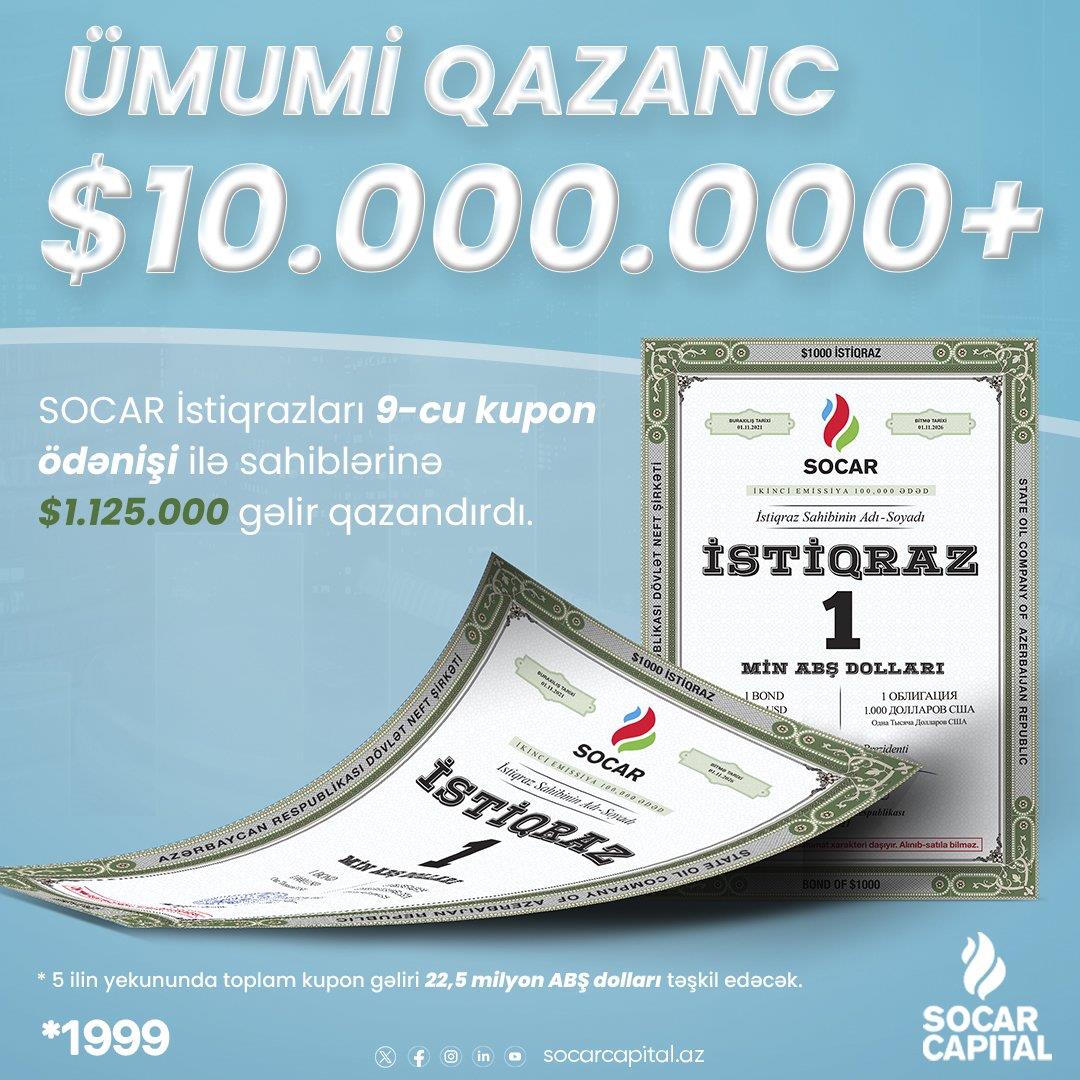 As a result of the ninth coupon payment, new SOCAR bonds, which have become the most in-demand securities for the 3-year period of their public offering on the Baku Stock Exchange, brought $1.125 million of income to bond holders. The total income of bond holders earned to the date, therefore, reached $10,125,000 (at the end of the 5-year period, the total income will be 22.5 million US dollars).