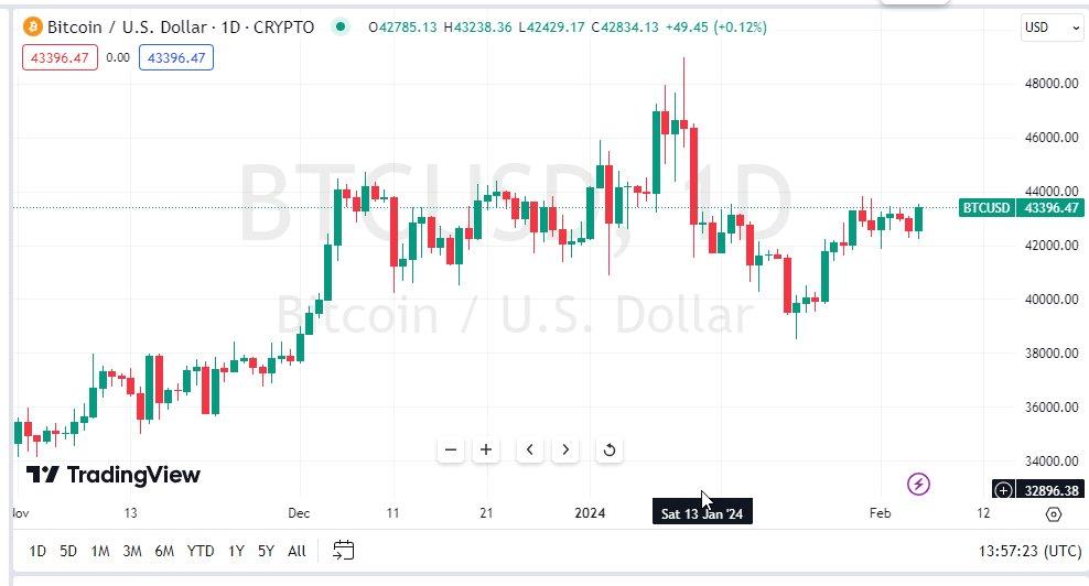 Looking at the Bitcoin market , Friday's trading activity was uneventful, mirroring the week's overall lack of significant developments. The market previously experienced substantial upward momentum, driving Bitcoin to reach approximately $43,000. The recent excitement surrounding the exchange-traded fund (ETF) contributed to an 80% surge in Bitcoin's value. However, with the subsequent absence of new buyers, the market currently finds itself in a state of stasis.In terms of potential price movements, a break above the $44,000 mark could pave the way for a push towards $48,000, a level that previously witnessed notable selling pressure. Conversely, the $40,000 threshold represents a substantial support level , while the market's attention also remains focused on the $38,500 range. Forex Brokers We Recommend in Your Region See full brokers list 1 Read full review Get Started Neutral State of AffairsPresently, Bitcoin appears to be in a neutral state, devoid of any inherently positive or negative attributes. It may continue to undergo a period of relative inactivity, potentially causing some to lose interest temporarily.Over the long term, as Bitcoin strives to consolidate its substantial gains, there is a likelihood of a breakout towards the $52,000 level. However, this outcome hinges on the trajectory of interest rates in the United States. The unexpected results of the recent jobs report had a notable impact on the bond market, potentially hindering investor enthusiasm for risk assets like Bitcoin. Nevertheless, the prevailing trend for Bitcoin remains upward, and short-term pullbacks are viewed as opportunities for investors to accumulate positions.In the end, Bitcoin's current state of quiescence is indicative of a market in transition. While the future appears promising, the present circumstances suggest that investors may consider gradually building their positions, exercising caution due to the potential for volatility. Bitcoin's long-term outlook remains bullish , reinforcing the notion that patience and strategic accumulation may be key to realizing future gains in this dynamic market.Ready to trade Bitcoin USD ? Here are the best MT4 crypto brokers to choose from.