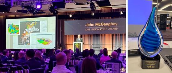 Figure 1. John McGaughey (at left), Mira Geoscience's President, accepting the 2023 AME Innovation Award (close captured on the right) for the development of GEOH5, during the 2024 AME Award Ceremony in Vancouver, BC, on January 26, 2024.