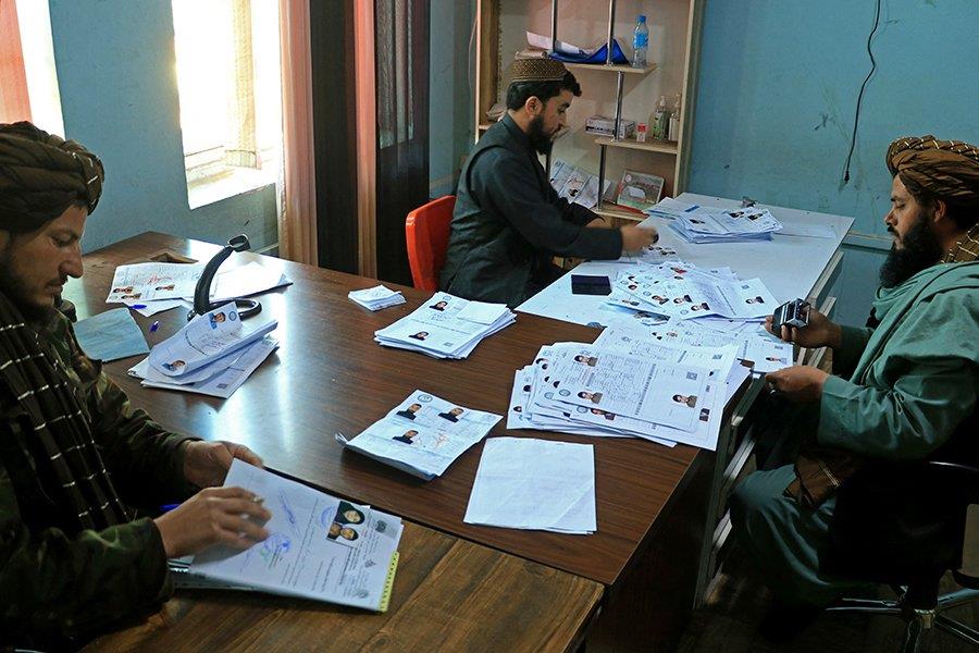 Officials check the files of applicants at the passport office, in Herat on January 29, 2024. (Photo by Mohsen Karimi / AFP)