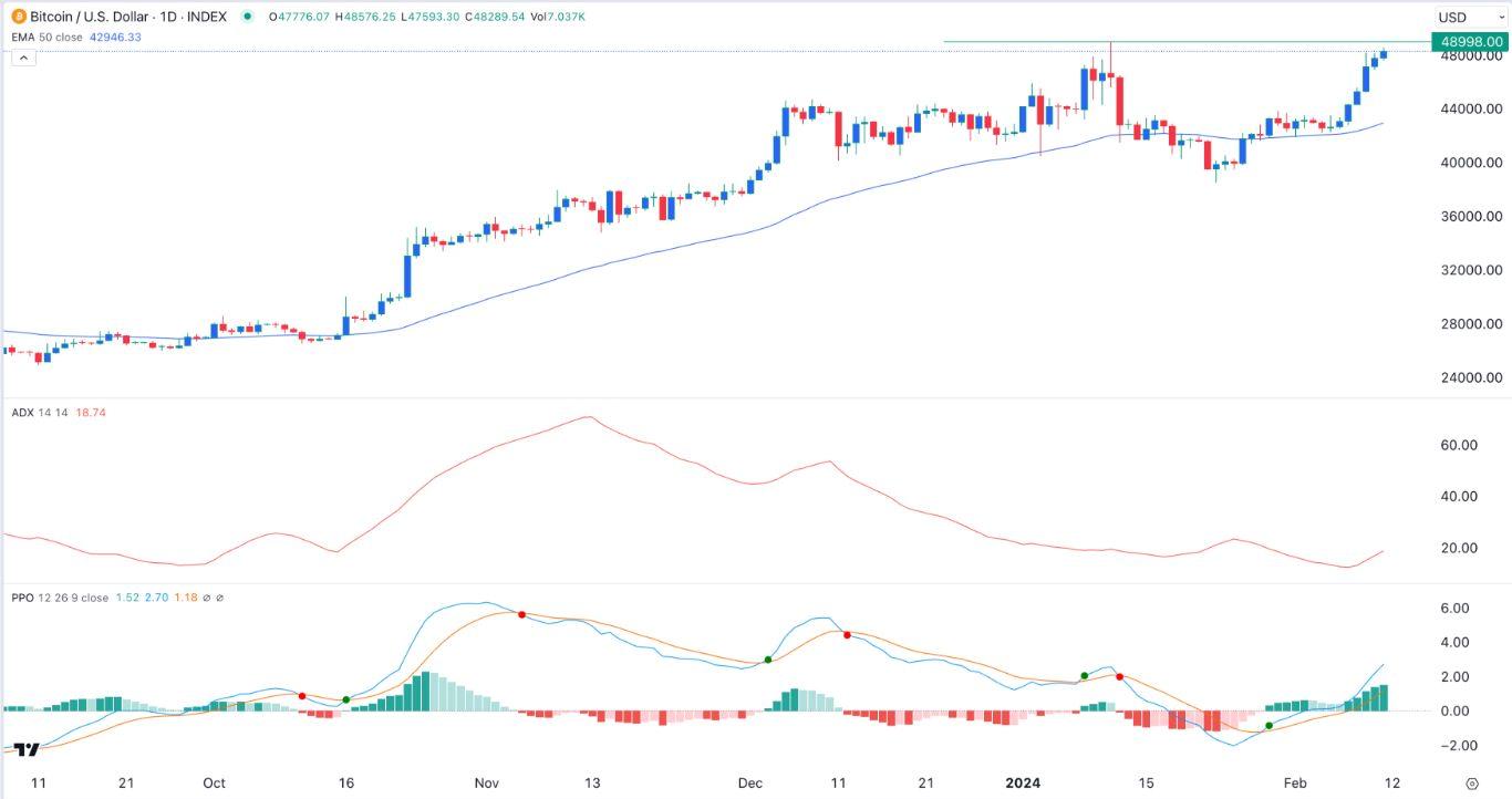Bitcoin price continued its strong comeback during the weekend as it approached its highest point this year. The BTC/USD pair has risen in the past seven straight days and was trading at over 48,000 on Monday morning. This rally triggered a strong comeback of other digital currencies like Ethereum, Solana, and Avalanche ETF demandThere are two main reasons why the BTC/USD pair staged a strong comeback recently. First, there are signs that investors have embraced a risk-on sentiment in the past few weeks. This view is supported by the fact that American equities have surged, with the S&P 500 index sitting at its all-time high.Further, the CNN Money fear and greed index has moved to the extreme greed zone while bond yields have pulled back. This performance is happening as the Federal Reserve makes the case for rate cuts at a time when the economy is doing well. Forex Brokers We Recommend in Your Region See full brokers list 1 Read full review Get Started Second, and most importantly, there are signs that investors are piling into spot Bitcoin ETFs. A look at these funds shows that those offered by the likes of Blackrock and Fidelity have attracted over $5 billion in the past few weeks.Analysts expect that this demand will continue if Bitcoin continues doing well. The idea is that many institutional investors will allocate a small portfolio in these ETFs because Bitcoin has outperformed traditional assets in the past 15 years.Looking forward, the BTC/USD pair will likely continue doing well as traders embrace Fear of Missing Out (FOMO) now that it is approaching the key resistance at $50,000/USD technical analysisBitcoin price surged to over $49,000 after the Securities and Exchange Commission (SEC) approved the spot Bitcoin ETF in January. It then plunged hard to $38,500 as investors sold the news and took the initial profits. Recently, it has made a strong bullish breakout and is now nearing the YTD high. It has remained above the 50-day moving average.The Average Directional Index (ADX) indicator has risen to 20, signaling that it has a strong demand. Further, the Percentage Price Oscillator (PPO) indicator has moved above the neutral point, which is also a positive sign.Therefore, the outlook for Bitcoin is bullish , with the next point to watch being at $50,000. In the long term, there is a likelihood that the coin will jump to the all-time high of over $67,000.Ready to trade our daily Forex signals ? Here's a list of some of the best crypto brokers to check out.