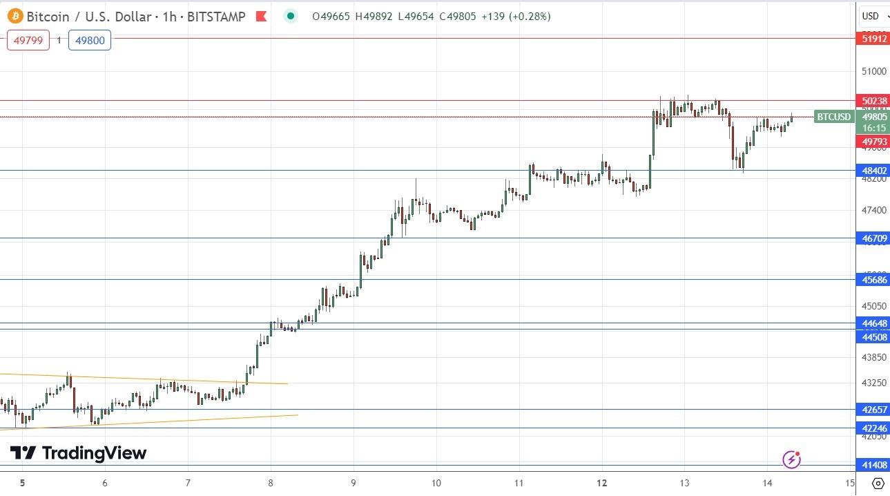 that occurs at the given levels. Forex Brokers We Recommend in Your Region See full brokers list 1 Read full review Get Started BTC/USD AnalysisI wrote in my previous BTC/USD analysis one week ago that the technical picture was more bullish as price action was contained within a narrowing triangle pattern .I thought we were most likely to see a bullish breakout above this triangle, which could send the price higher to reach the next resistance level at $44,508. This was a very accurate and profitable call, with the strong bullish breakout giving an excellent entry signal.The price went on to advance over recent days to reach a new 20-month high price but has struggled over the past few days to get established above $50k which is acting as a strong natural resistance point .I think the $50k area will remain pivotal and may give an opportunity for a speculative short, or alternatively a long trade once we get a daily close firmly above $50k.I favour the long trade entry, but I will wait for a New York close above the resistance level at $50,528.There is nothing of high importance scheduled today regarding the US Dollar.Ready to trade our daily Bitcoin signals ? Here's our list of the best Bitcoin brokers worth reviewing.