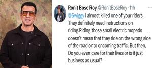 The actor wrote: "@Swiggy I almost killed one of your riders. They definitely need instructions on riding. Riding those small electric mopeds doesn't mean that they ride on the wrong side of the road onto oncoming traffic. But then, Do you even care for their lives or is it just business as usual?"