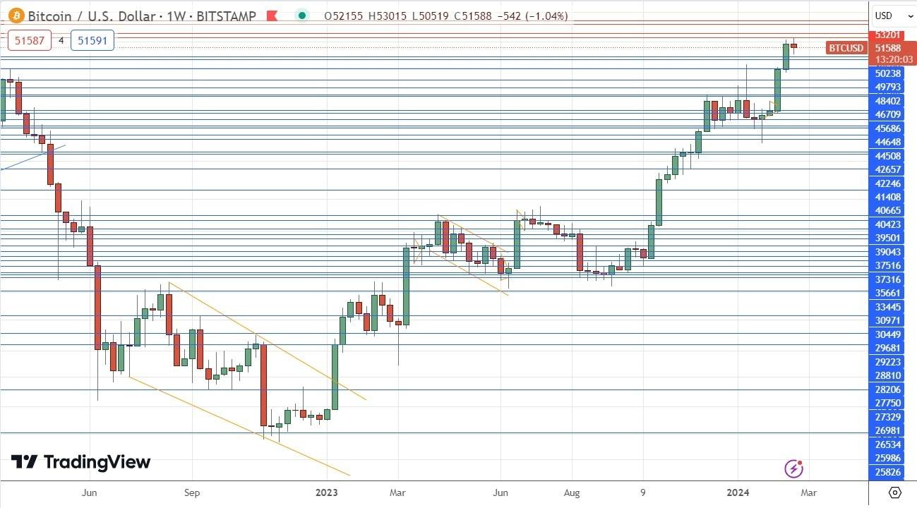 Bitcoin Bitcoin made a firm bullish breakout three weeks ago, but has made a narrow consolidation over the past week just below $53,000 after printing a new 20-month high. I see Bitcoin as a buy, given legs by the recent approval of Bitcoin ETFs, which attracts more retail investment, although it will quite likely be best to wait for a new bullish breakout or a bounce at a key support level before doing so. I would wait until we get a daily close above the high closing price of $52,161 before entering a new long trade here .