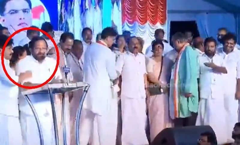 According to BJP leaders, the MLA was promptly interrupted by others, and then someone suggested playing it through a CD. Thiruvananthapuram MP Shashi Tharoor is also seen on stage.