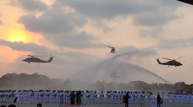 The event featured a captivating fly-past by a formation of Seahawks and a traditional water canon salute, marking the historic occasion.