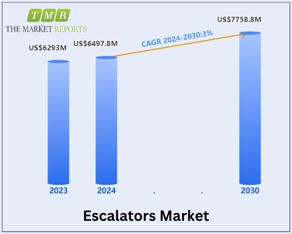 The global Escalators Market was valued at US$ 6293 million in 2023 and is anticipated to reach US$ 7758.8 million by 2030, witnessing a CAGR of 3.0% during the forecast period 2024-2030.