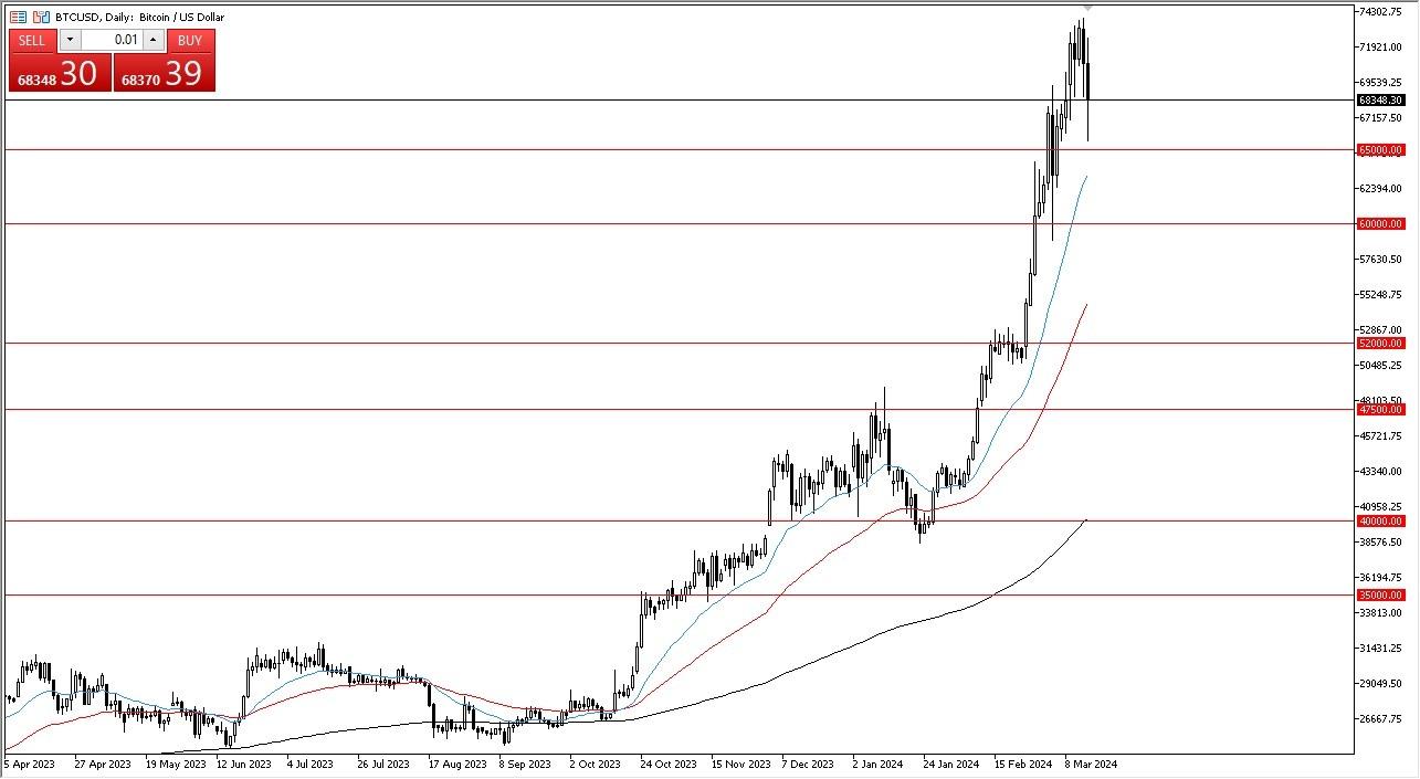 The ETF inflows on Wall Street will eventually run out, and when they do, the question then becomes what happens next? I believe that there is going to be a significant amount of profit taking sometime soon, and that might have been shown a little bit during the early hours on Friday. Whether or not we get a significant breakdown remains to be seen but every time we pull back, you have to be looking for some type of bounce that we can take advantage of and find plenty of value. I have no interest in trying to fight this massive trend that the people have decided to jump on and as a result this is a feedback loop.Ready to trade Bitcoin USD ? Here are the best MT4 crypto brokers to choose from.