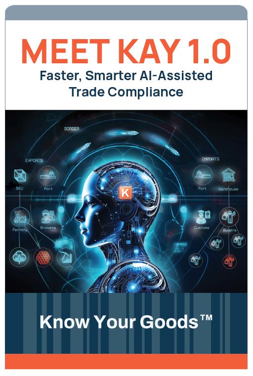 KYG Trade | Know Your GoodsTM is a next-generation AI-Assisted orchestration platform and marketplace purpose-built for global trade and customs compliance. Our open, extensible and API-friendly architecture and automated workflows simplify the gathering of product information, which reduces emails, attachments, and eliminates redundancy. Our AI-Assistant, Kay, along with our TradeKorpusTM saves importers and exporters time researching global import and export regulations. Our Marketplace provides numerous 3rd party content and automation“oracles” to assist with HS and export classifications, FTA qualification, supplier solicitations, SKU-based product traceability, forced labor supplier mapping, detention case management, restricted party and sanctions screening, as well as false positive hit dispositioning. These advancements enable our clients to work faster and smarter, get more done with the same resources, reduce penalty risk, and achieve ROI by unlocking duty and cost savings.