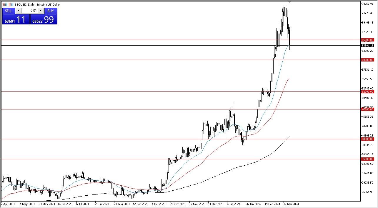 If that's going to be the case, it's going to act like an institutional market. I'm looking for signs of stability and perhaps maybe even a long wick underneath the candle to show that buyers have come back in. One candidate right now is the $60,000 level. It's an area that I think a lot of people will be paying attention to. Underneath there, we then have the $50,000 level and the 50 day EMA. In general, this is a market that I think you do buy the dip, but I don't think we're done pulling back yet.Ready to trade BTC/USD ? Here's a list of some of the best crypto brokers to check out.