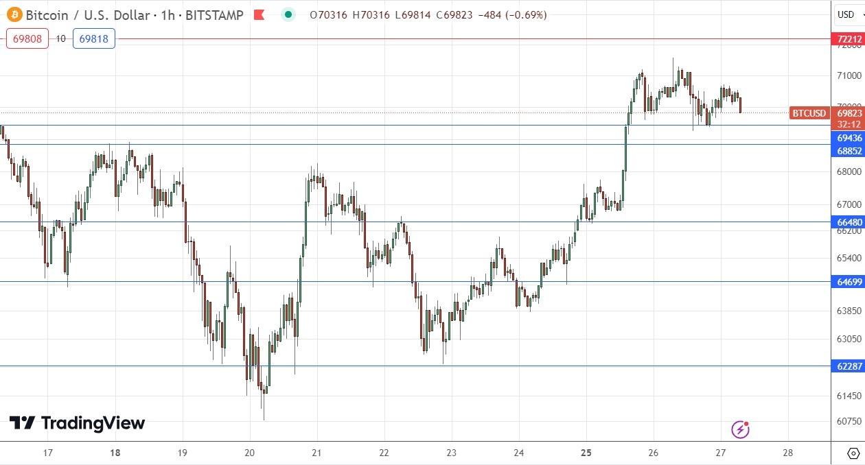 that occurs at the given levels. Forex Brokers We Recommend in Your Region See full brokers list 1 Read full review Get Started BTC/USD AnalysisI wrote in my previous BTC/USD analysis on Tuesday last week that the technical picture was now considerably more bearish as the price fell with no obvious support levels until about $60,000 was reached. This was a great call as it gave an immediate short trade entry that went below $61,000 that day, although it never quite reached $60,000.The price of Bitcoin has basically recovered since then, but now looks like it has topped out at about $71,000 some way below the recent all-time high near $74,000. The price is currently heading lower, and it looks as if the potentially supportive zone between $69,436 and $68,852. I think its likely this zone will be reached, and the zone should be pivotal today. That means two consecutive hourly closes below that zone could be a good short trade entry signal targeting the next support level at $66,480. On the other hand, if the zone produces a bullish bounce, especially if $68,852 is rejected, that could be an attractive long trade entry. Personally, I want to see Bitcoin make a new high about $74,000 before taking any long trades, especially in this area after the price has been rising for a few days.Ready to trade our daily Bitcoin signals ? Here's our list of the best cryptocurrency brokers worth reviewing.