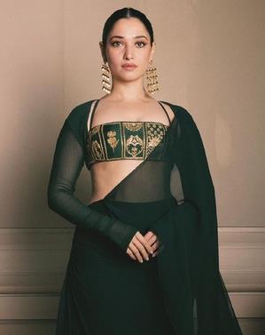 Taking to Instagram, the diva, who was last seen in Malayalam film 'Bandra', posted some pictures, wherein Tamannaah is wearing a sleeveless bottle green coloured blouse, with golden embroidery on it.