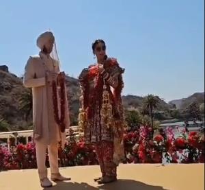 As the two embrace each other, people around them shower the couple with flower petals. The wedding festivities were an intimate affair with very few people from the industry attending the wedding.