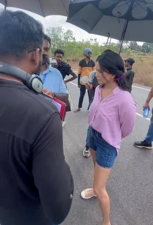 In the video, she can be seen being briefed on a scene. The actress appears wearing a pink coloured shirt which she paired with denim shorts.