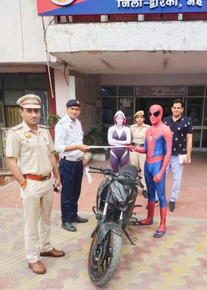 According to police, a post went viral on social media in which a person without a helmet was riding a bike without a number plate, and was doing a stunt in a spiderman costume on Urban Extension Road-II (UER II) or NH-344M in the national capital.