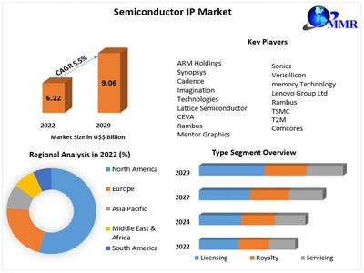 "Semiconductor Intellectual Property (IP) Market"Semiconductor IP Market size was valued at US$ 6.22 Bn. in 2022 and the total revenue is expected to grow at 5.5 % through 2022 to 2029, reaching nearly US$ 9.06 Bn.