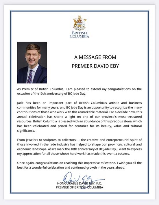 From jewelers to sculptors to collectors - the creative and entrepreneurial spirit of those involved in the jade industry has helped shape our province's cultural and economic landscape. As we mark the 10th anniversary of BC Jade Day, I want to express my appreciation for all those whose hard work has made this event a success...