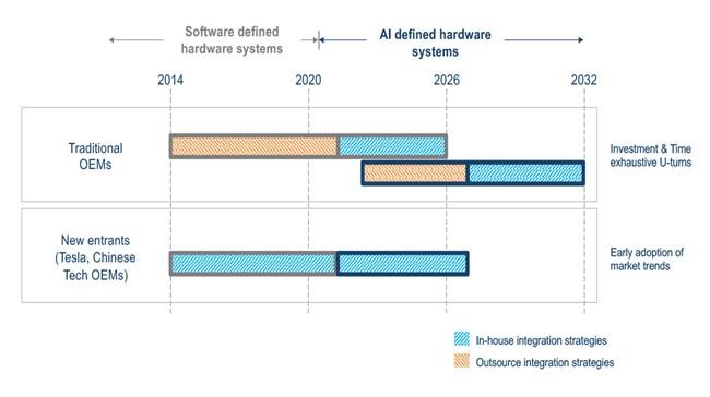 Figure 6: CASE and AI-defined Vehicle Strategies over timeline: traditional OEMs vs new entrants