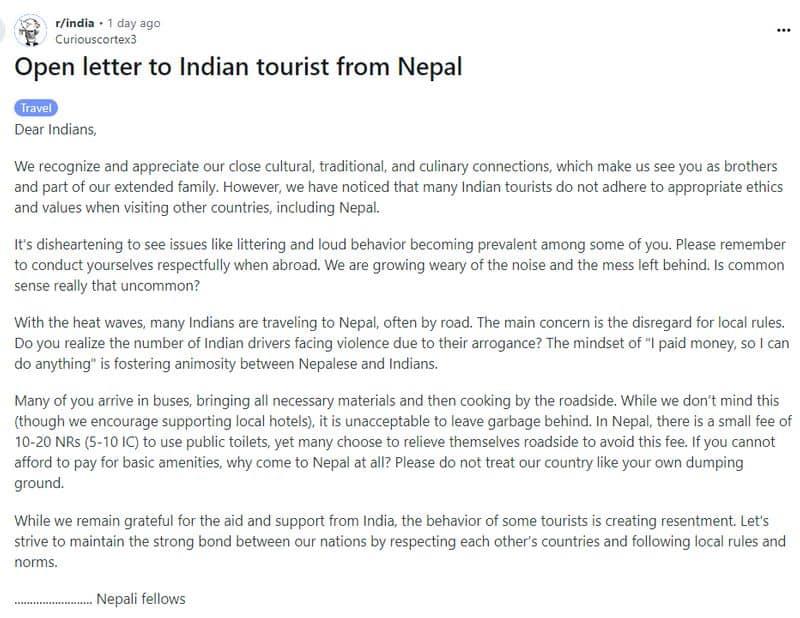 "Dear Indians," the letter opens, "We recognize and appreciate our close cultural, traditional, and culinary connections, which make us see you as brothers and part of our extended family. However, we have noticed that many Indian tourists do not adhere to appropriate ethics and values when visiting other countries, including Nepal."