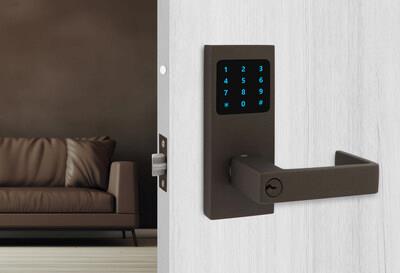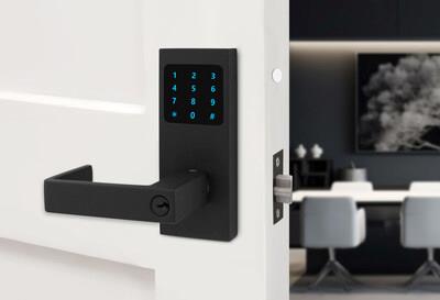 INOX introduces the Smart Cylindrical lock, shown here in C19 Black CeraMax finish with a 734 Kobe lever. Communicating through Bluetooth and Wi-Fi, the Smart Cylindrical includes an integrated RFID reader and a keypad that offers three types of passcodes. This lock meets code compliance for ANSI/BHMA 156.12 and UL 10B/10C with a 3-hour fire rating. The Smart Cylindrical lock is offered with eight elegant finishes for added strength and beauty, as well as an available antimicrobial coating.