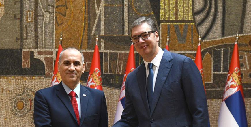 AMMAN - Zuheir Nsour on Friday presented his credentials to President of Serbia Aleksandar Vucic as the Kingdom's accredited non-resident ambassador to Serbia, during a ceremony held at the residential Palace in Belgrad. Nsour conveyed His Majesty King Abdullah's greetings to President Vucic and his best wishes for further progress and prosperity to the Serbian people, the Jordan News Agency, Petra, reported on Monday.