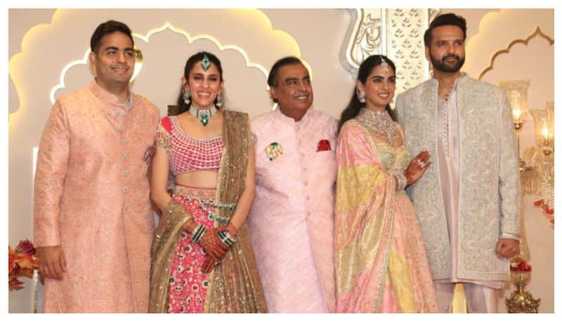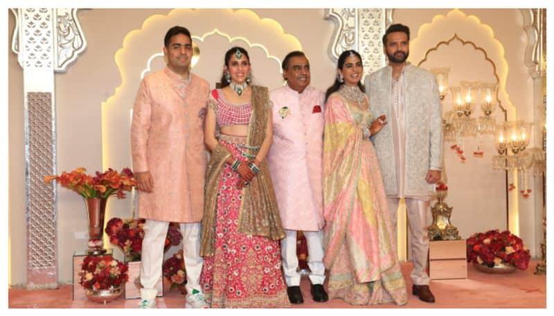 The Ambani family arrived punctually, with Mukesh Ambani happily posing with his children and their partners. Shloka wore a rani pink lehenga, while Isha opted for soft pink, and Mukesh chose a matching sherwani, with Akash looking dapper in a peach-toned outfit