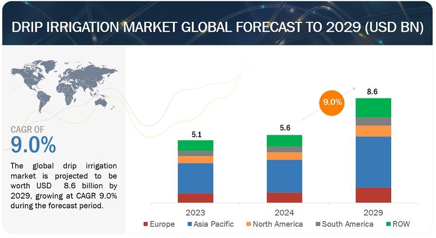 The drip irrigation market size is estimated at USD 5.6 billion in 2024 and is projected to reach USD 8.6 billion by 2029, at a CAGR of 9.0% from 2024 to 2029. The drip irrigation market is being driven by several key factors, including the growing need for water conservation due to increasing water scarcity and climate change, which necessitates efficient irrigation methods. Additionally, the rising demand for higher crop yields and better quality produce, spurred by the expanding global population and food security concerns, is encouraging the adoption of precision agriculture technologies like drip irrigation. Government initiatives and subsidies supporting modern irrigation systems, along with technological advancements that make drip irrigation systems more affordable and easier to install and maintain, further propel market growth. Lastly, the increased awareness among farmers about the economic and environmental benefits of drip irrigation, such as reduced water usage and minimized fertilizer runoff, is also contributing to its widespread adoption.