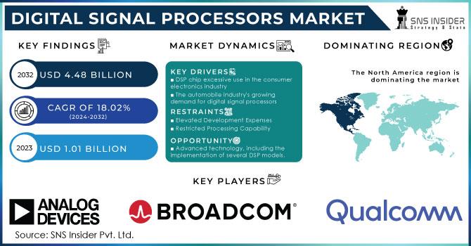 - The report offers in-depth knowledge of the Digital Signal Processors Market, assisting clients in comprehending market dynamics, trends, and growth opportunities. The research consists of a detailed competitive analysis, enabling clients to compare their performance with main market competitors and pinpoint opportunities for enhancement. The report focuses on new chances in the DSP market, helping clients recognize and take advantage of possible investment areas. The research delves into the latest technological advancements and product developments in the DSP market.