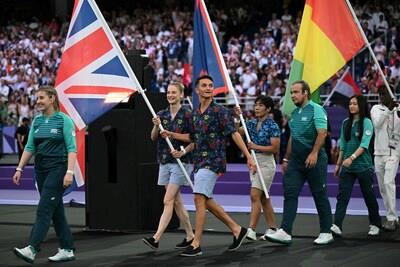 Britain's flag bearers Britain's gymnast Bryony Page (L) and Britain's Triathlon athlete Alex Yee (R) enter the stadium during the closing ceremony of the Paris 2024 Olympic Games at the Stade de France, in Saint-Denis, in the outskirts of Paris, on August 11, 2024. (Photo by Oli SCARFF / AFP) (Photo by OLI SCARFF/AFP via Getty Images) Courtesy of Ben Sherman