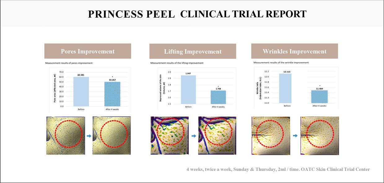 In clinical trials conducted by the OATC Skin Clinical Trial Center, involving 20 Korean adult women aged 30 to 60, Storyderm's Princess Peel demonstrated significant improvements in pore appearance, moisture retention, wrinkle reduction, skin tone, elasticity, and lifting, earning it recognition as a comprehensive anti-aging solution.