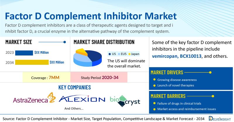 (MENAFN- GlobeNewsWire - Nasdaq) The factor D complement inhibitor market is projected to experience rapid growth due to the expansion of indications for already approved therapies, such as danicopan for geographic atrophy, and the anticipated approval of emerging therapies like vemircopan during the forecast period. Advances in biotechnology and a rising prevalence of autoimmune diseases are fueling demand for targeted therapies. Additionally, the expanding pipeline of drug candidates and clinical trials are expected to propel market expansion in the coming years.New York, USA, Aug. 19, 2024 (GLOBE NEWSWIRE) -- Factor D Complement Inhibitor Market Will Witness Robust Growth with Emerging Therapies by 2034 | DelveInsight