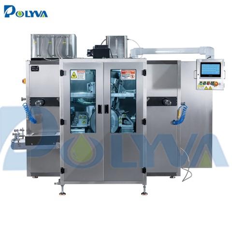 The PVA packaging machine is a high-capacity, rotary drum-type unit designed specifically for forming, filling, sealing, and cutting non-aqueous liquid pods, such as high-concentrated laundry detergent pods. It showcases Polyva's latest advancements in packaging technology, offering superior adaptability to water-soluble PVA films and detergent liquids.