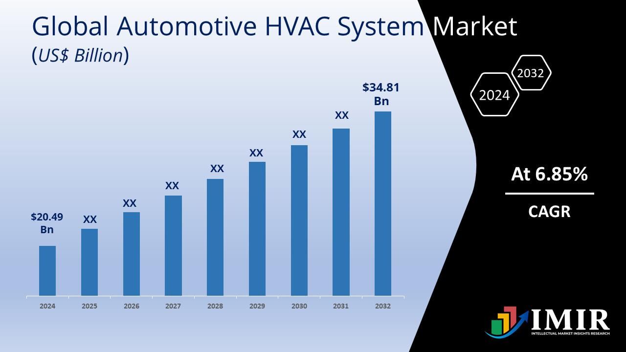 Gondia, India, Oct. 16, 2024 (GLOBE NEWSWIRE) -- Global Automotive HVAC System Market size was valued at US$ 19.18 Billion in 2023 and is poised to grow from US$ 20.49 billion in 2024 to US$ 34.81 Billion by 2032, growing at a CAGR of 6.85% in the forecast period (2024-2032).