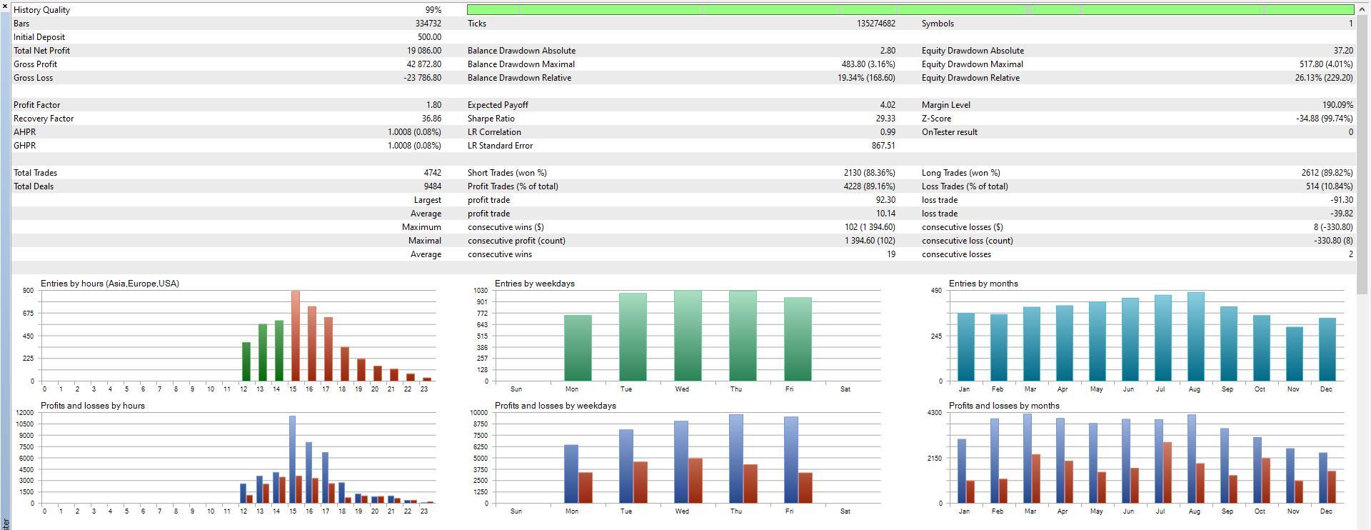 EliteX's backtesting data showcases unparalleled results. With an initial deposit of $500, the bot generated a net profit of $19,086 while maintaining a stellar profit factor of 1.80. EliteX achieved an 89.16% win rate across 9,484 trades, ensuring consistent profitability for its users. With a maximum drawdown of just 3.16%, the bot provides a balanced approach between risk and reward, making it a reliable tool for traders seeking long-term growth.