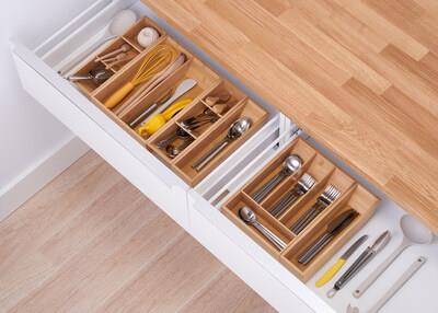 The TRINITY EcoStorage® 6-Piece Bamboo Drawer Organizer Set with Dividers is a patent-pending storage solution that optimizes space efficiency with its unique, angled storage design that increases storage capacity. Unlike traditional flat drawer organizers, this angled set allows utensils and other long items such as spatulas, serving ware, and tongs to be stored at an angle. The modular six-piece set features adjustable dividers, offering customization to fit various storage needs in kitchen, office, or bathroom drawers .