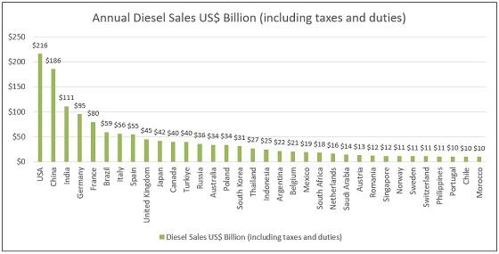 Brisbane, Queensland, Australia--(ACN Newswire - February 24, 2025) - Graphene Manufacturing Group Ltd. (TSXV: GMG) (OTCQX: GMGMF) ("GMG" or the "Company") is pleased to announce the results of the multi-year performance testing of G® Lubricant , a transformative graphene liquid concentrate additive designed to enhance the performance of diesel and gasoline (petrol) engines. This product has the potential to reshape the future of the global liquid fuels industry and offers an innovative solution that optimizes efficiency and power for stationary or mobile engines. GMG is in the process of preparing packaging and marketing materials for G® Lubricant , and expects to begin a direct marketing campaign, targeting fleet owners and initially commencing in Australia and then expanding into other markets from April 2025 onwards. Click here to order a G® Lubricant sample for your own engine testing. Unleashing the Power of Graphene G® Lubricant, a graphene liquid concentrate that can be added to any mineral or synthetic oil used in an internal combustion engine, has been shown to increase fuel efficiency by up to 8.4% in a diesel engine. The amount of graphene in the final lubricant once G® Lubricant is mixed in is only ~ 1:10,000, with the balance of the concentrate consisting of lubricating base oil. As a result, G® Lubricant can be used safely in any internal combustion engine. Over the past four years, GMG has conducted environmentally controlled testing of G® Lubricant in internal combustion engines monitored and verified by The University of Queensland. GMG's test results have been corroborated by similar savings realized by customers over a number of years of field testing. Figure 1 below shows the high level fuel efficiency improvement provided by the G® Lubricant additive, while Figure 8 provides the detailed fuel testing parameters. Figure 1: Diesel Engine Fuel Efficiency Improvement provided by G Lubricant To view an enhanced version of this graphic, please visit: The data shows a clear increase in fuel efficiency performance from G® Lubricant when the load is increased on the engine. High loads for truck diesel engines are usually seen when the truck starts to move, and then at high speeds when encountering wind resistance. Usually stationary diesel engines for power generation operate at high load. Figure 2 shows the potential savings for the main types of diesel engine commercial vehicles in use in Australia - with average vehicle data sourced from the Australian Bureau of Statistics[1] (ABS). Figure 2: Potential Cost Savings per Vehicle Type provided by G Lubricant To view an enhanced version of this graphic, please visit: Exceptional Performance Confirmed by University of Queensland GMG's Managing Director and CEO, Craig Nicol, commented: " G® Lubricant has taken over 4 years of advanced product testing and is transformational for energy efficiency and emissions reduction for the liquid fuels industry - it is the culmination of decades of lubricants, engines, energy markets and graphene knowledge which is inherent in the GMG business. The next challenge to commercialise this product awaits - which we are eagerly preparing for." GMG's Chairman and Director, Jack Perkowski, commented: " G® Lubricant's performance, which demonstrates an 8.4% improvement in fuel efficiency using only a very small amount of graphene in an easy to use graphene concentrate, is a 'Category Creator' that has the potential to redefine the multi trillion dollar liquid fuels market. The fact that only 1% of G® Lubricant is needed to achieve such savings provides a very attractive value proposition for fleet owners." Click here to order a G® Lubricant sample for your own engine testing. US$ 1.4 Trillion Global Diesel Industry Whilst G® Lubricant can be used to reduce fuel consumption in both diesel and gasoline/petrol engines GMG intends to focus on the diesel market initially, which is largely B2B focused, and therefore, more targeted as far as fuel cost savings and performance. GMG calculates that global diesel fuel sales totalled US$1.4 Trillion per annum[2] including taxes and duties on approximately 28 million barrels of diesel per day as detailed by the EIA2. Figure 3 shows the top 34 countries in the world with diesel fuel sales greater than US$10 Billion per annum. Figure 3: Total Diesel Fuel Sales US$ Billion To view an enhanced version of this graphic, please visit: Estimated US$ 1.2 Billion Per Annum Global Diesel Market For G® Lubricant Assuming an average fuel savings of 8.4%, GMG believes that a conservative estimate of the potential market for G® Lubricant is 10% of the fuel savings realized by users annually. Assuming G® Lubricant pricing equal to 10% of the savings realized, GMG estimates that the potential global revenue for G® Lubricant is US$ 1.2 Billion sales per annum. Figure 4 shows GMG's estimates of potential annual sales of G® Lubricant by country.