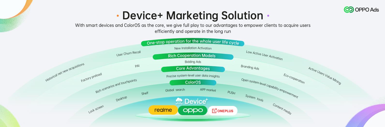 During the event, Gavin Zou unveiled the Device+ Marketing Solution, designed to help advertisers efficiently acquire large numbers of high-quality users, conduct user operations on the OPPO platform, and expand business boundaries. Based on OPPO's massive mobile Internet ecosystem, Device+ offers global clients a one-stop user management service through preload, advertising, and ecosystem cooperation. It covers new user acquisition, user activity improvement, and user conversion, among other things, to meet clients' user operation needs at various stages.