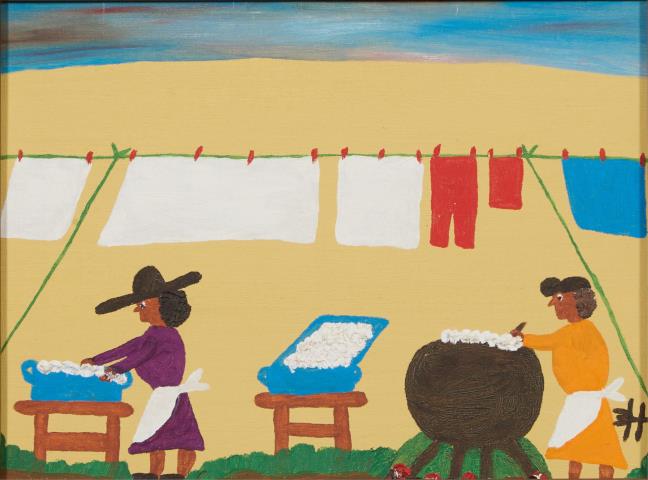 The oil on canvas board painting titled Wash Day by the renowned African American folk artist Clementine Hunter is a fine representation of her work and is expected to fetch $4,000-$8,000.