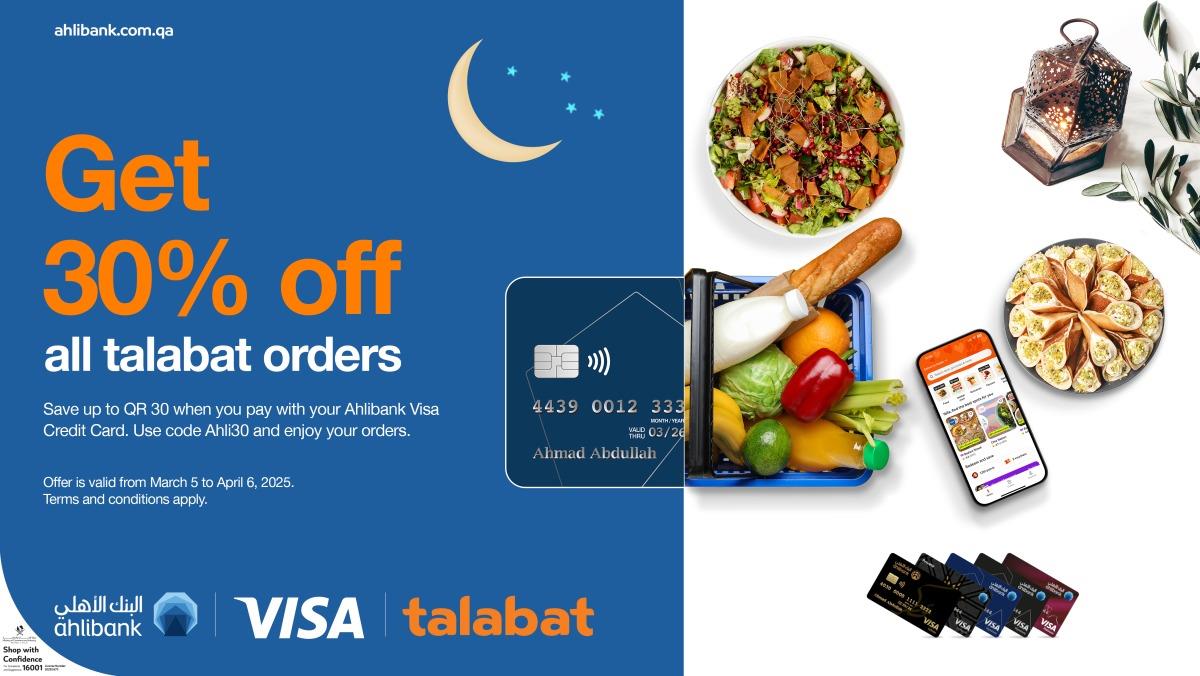 As part of this special promotion, Ahlibank Visa credit cardholders can enjoy a 30% discount on all Talabat orders by using their card and the promo code Ahli30, saving up to QR30 per transaction.