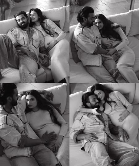 The second shot shows Athiya flaunting her baby bump in a white t-shirt paired with unbuttoned denim jeans. One of the photos shows the dad-to-be adorably putting his hand on Athiya's belly as they strike a romantic pose on the couch.