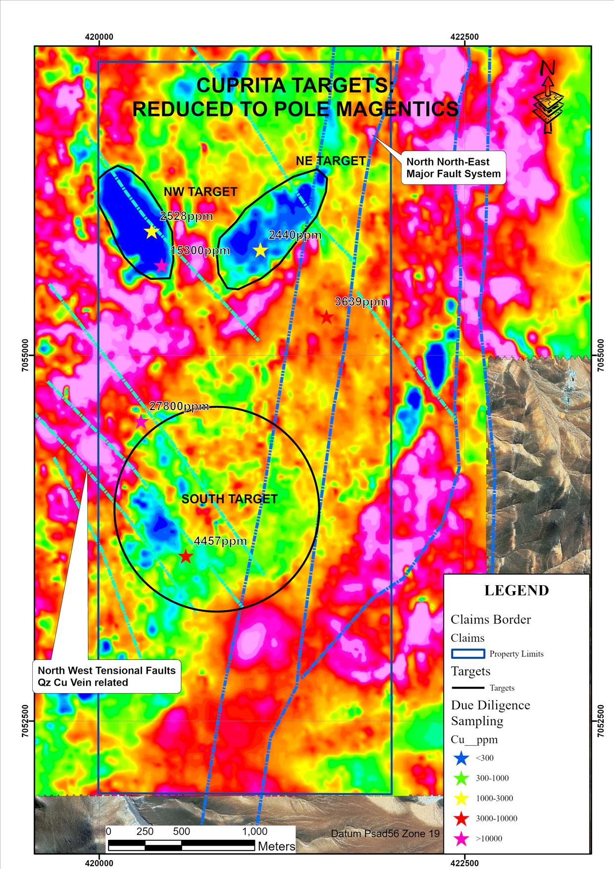 There are at least three target zones (figure 2) identified to date marked by coincidence of geophysical, geochemical and geological evidence supporting the presence of hydrothermal alteration and mineralization. The review of historical data and field verification during the Company's due diligence review, revealed the presence of three porphyry targets which will be the priority for the initial exploration at Cuprita. Following is a brief description of each target: