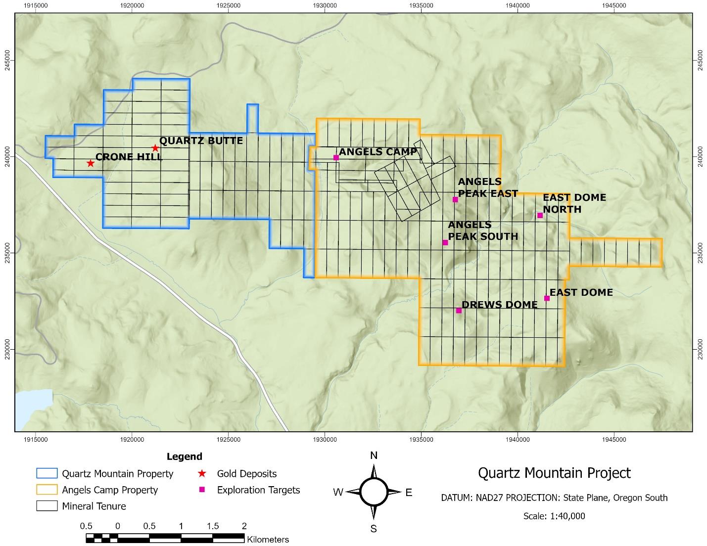 Figure 1: Map showing the claims of the Quartz Mountain Project with the Crone Hill and Quartz Butte claims in blue and Angel's Camp claims in orange.