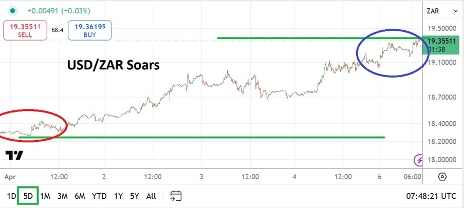 (MENAFN- Daily Forex) The USD/ZAR in early trading this morning is elevated and challenging prices not seen since April 2024, this as financial institutions have used negative global market sentiment as a lynchpin to bet against the Rand broad global financial markets are in chaos early this morning and have been under a dark violent shadow since early Thursday of last week. The USD/ZAR is seeing a massive surge higher and finished Friday around the 19.20000 vicinity going into the weekend. This after starting last week near the USD/ZAR ratio of almost 28000 of the USD/ZAR has continued this morning and the 19.37000 vicinity is in sight as of this writing in extremely fast changing Forex conditions. Day traders who are contemplating betting on the USD/ZAR today may want to second and triple guess this consideration. Global Forex will remain dangerous and the USD/ZAR is among the most violent currency pairs because of a complex host of reasons. The price spread in the USD/ZAR is wide this morning. Top Forex Brokers 1 Get Started 74% of retail CFD accounts lose money Read Review BrokerGeoLists({ type: \u0027MobileTopBrokers\u0027, id: \u0027mobile-top-5\u0027, size: SidebarBrokerListAmount, getStartedText: \u0060Get Started\u0060, readReviewText: \u0060Read Review\u0060, Logo: \u0027broker_carrousel_i\u0027, Button: \u0027broker_carrousel_n\u0027, });Trump Tariffs and Fear of Wrong DirectionsYes, the Trump tariff policies have caught financial institutions by surprise because of their lack of precision and seemingly punitive ambitions. Global equities are being purged in the near-term as large traders await an opportunity to search for values. However, domestic political and fiscal issues in South Africa have also been escalating into troubled terrain the past few months. The combination of Trump tariffs and nervous conditions in financial institutions dealing with South African concerns have ignited a wave of buying in the USD/ZAR USD/ZAR is not correlating to the broad Forex market. Yes, choppy results have been seen in other major currencies paired against the USD, but the storm in the South African Rand appears to be more volatile. Sustaining highs above the 19.00000 level going into this past weekend and an inability to trade lower this morning is a sign nervous tension is high regarding outlook for the USD/ZAR. This leads to the conclusion financial institutions were looking for a reason to push the USD/ZAR higher Sentiment and Waiting for Positive ImpetusThe broad global markets are certainly waiting for signs of positive impetus to spring forth. But for the moment optimism is in short supply. Traders looking for value and who believe the USD/ZAR is overbought as it traverses highs not seen since April of last year may be proven correct \u0026ndash; eventually, for the moment day traders are advised to watch the USD/ZAR instead of trading it, unless the speculators understands the dynamics of the betting market which is in complete control for the moment for downside in the near-term may be tempting for the USD/ZAR, but it could prove a very expensive mistake if broad market sentiment in the global markets continue to produce historic levels of selling. EURUSD Chart by TradingView USD/ZAR Short Term Outlook:Current Resistance: 19.42000Current Support: 19.36200High Target: 19.47000Low Target: 19.33500