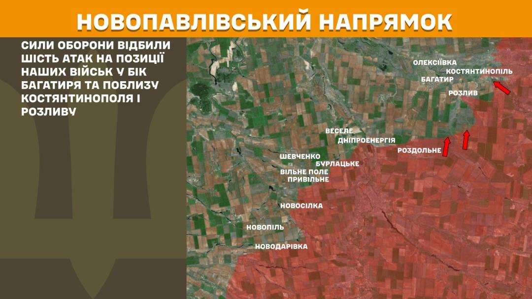 In the Novopavlivka sector, the Ukrainian Defense Forces repelled six hostile attacks in the vicinity of Bahatyry and near Kostiantynopil and Rozlyv.