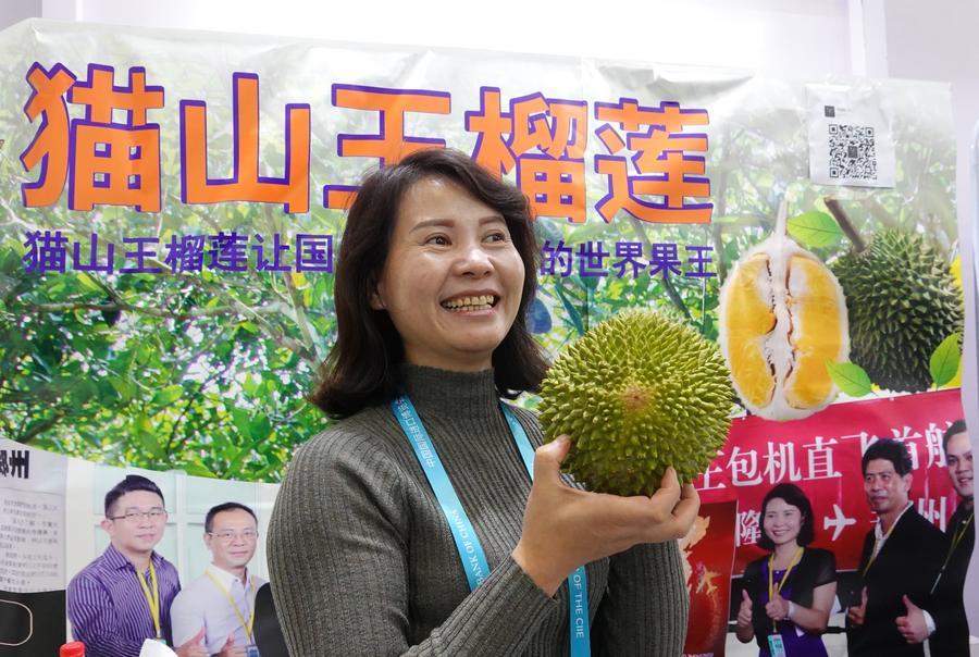 A staff member shows a durian from Malaysia at the Food and Agricultural Products exhibition area during the second China International Import Expo in Shanghai, east China, Nov. 9, 2019. (Xinhua/Cai Yang)