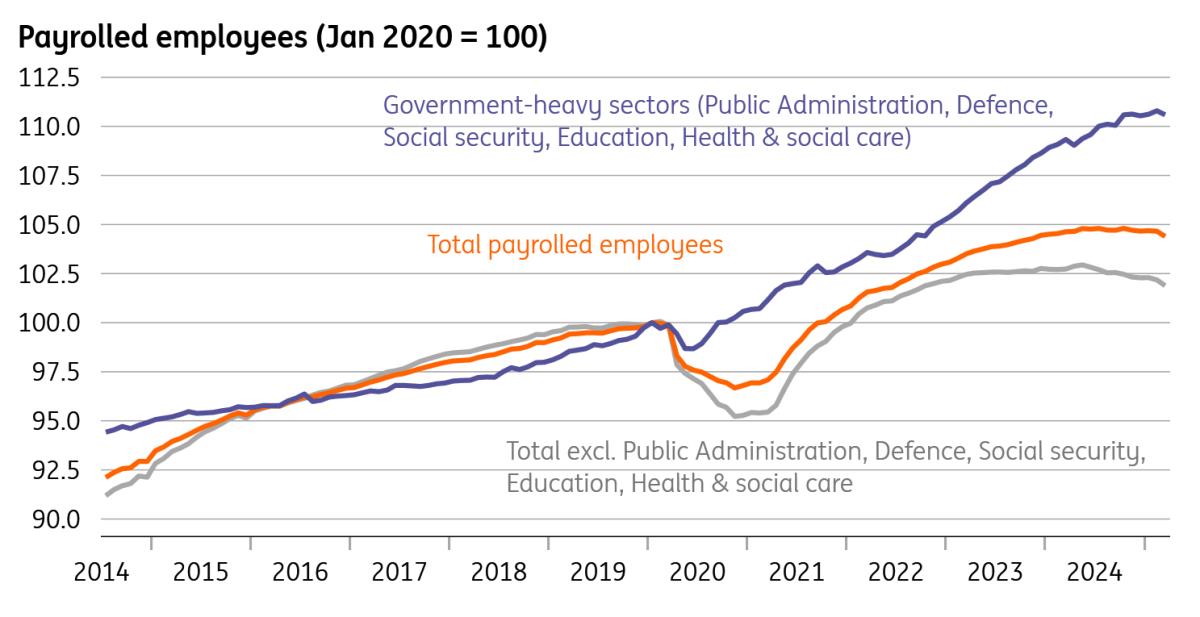 So far, at least, that's not really played out in the official numbers. The unemployment rate stayed at 4.4% in today's data, though admittedly that should be completely disregarded, given its well-publicised quality issues. Instead, we should look at the more reliable payroll-based employment data, and this did fall more steeply than expected by 78,000 in March, led by the private sector. The caveat is that this data is often revised up, and even if it isn't, the latest data is more consistent with the slow, modest fall in private employment we saw through 2024. The pace of decline doesn't look particularly worrisome at this stage.