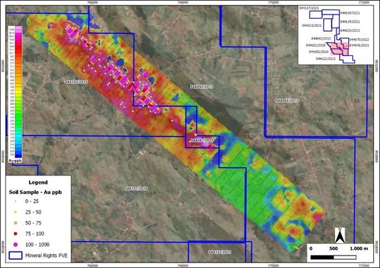 Figure 8 Map with the compilation of soil geochemistry campaigns carried out by MVV and PVE. First-order anomalies for gold marked in magenta with values between 100 and 1090 ppb.