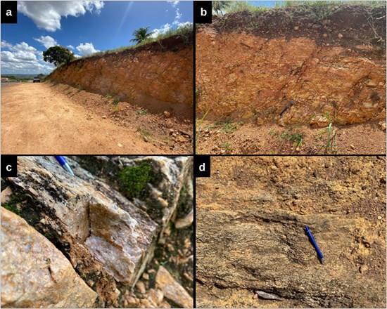 Figure 4 (a) Outcrop of fractured quartzite with the presence of (b) folded structure (flexural?); (c) quartzite with foliation trending to the NE and with boxwork and (d) outcrop of the quartzite with foliation trending to the SW